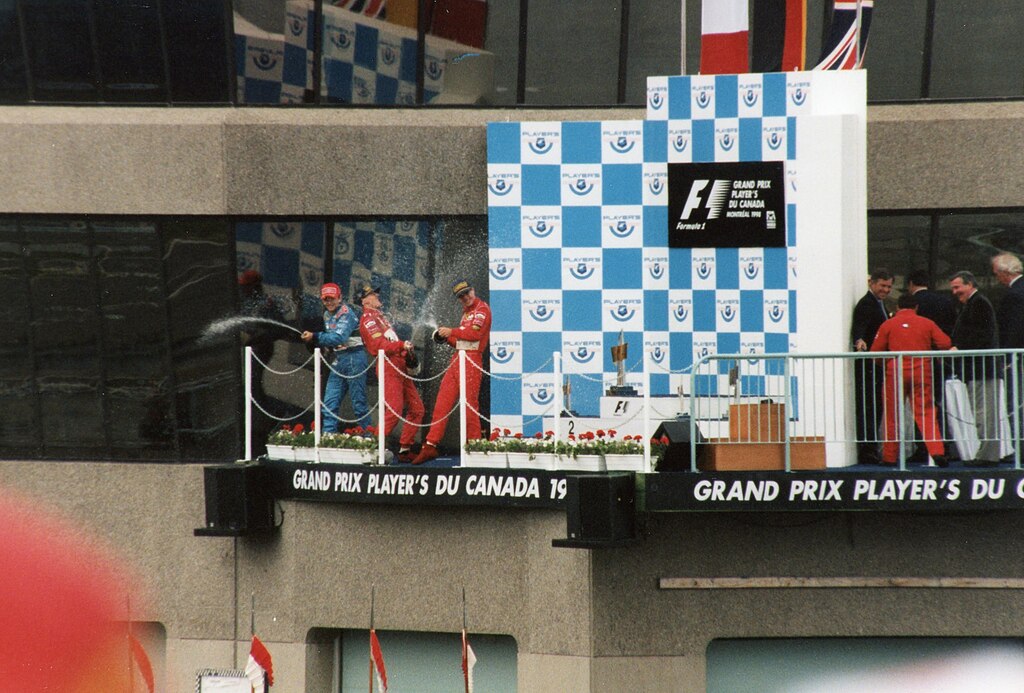 Eddie Irvine on the 1998 Canadian Grand Prix podium with Michael Schumacher and Giancarlo Fisichella. (Photo: Rick Dikeman, licensed under CC BY-SA 3.0, via Wikimedia Commons)