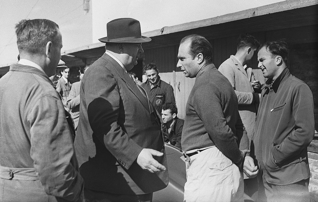 Juan Manuel Fangio and Mercedes-Benz racing manager Alfred Neubauer in 1955. (Photo: Public domain, via Wikimedia Commons, Cropped)